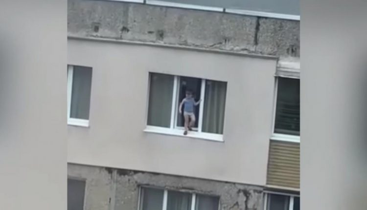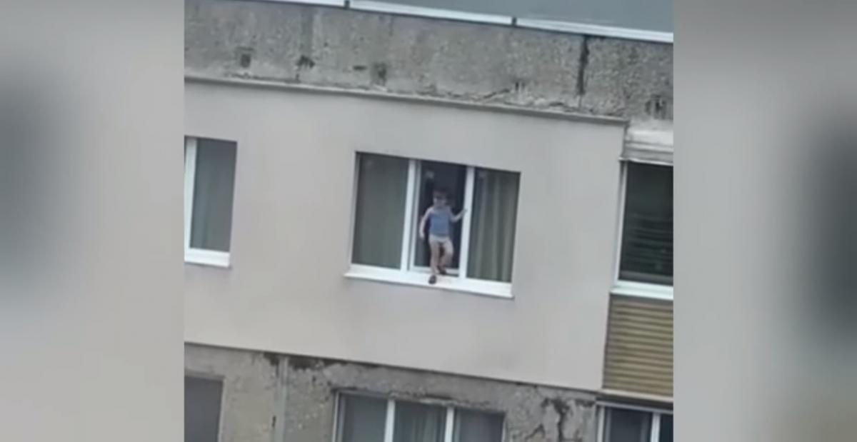 На кадрах видно, як хлопчик стоїть на металевому підвіконні, тримаючись однією рукою за раму, а потім заходить в кімнату.