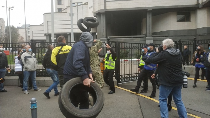 Група людей на чолі з активістом “Євромайдану” й колишнім нардепом Володимиром Парасюком закинула через паркан суду шини.