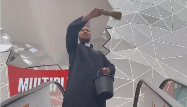 Цього разу чоловік вирішив прогулятися по міському ТЦ “Нікольський” у костюмі священника з кропилом. Відео жарту він виклав на своїй сторінці в Instagram.