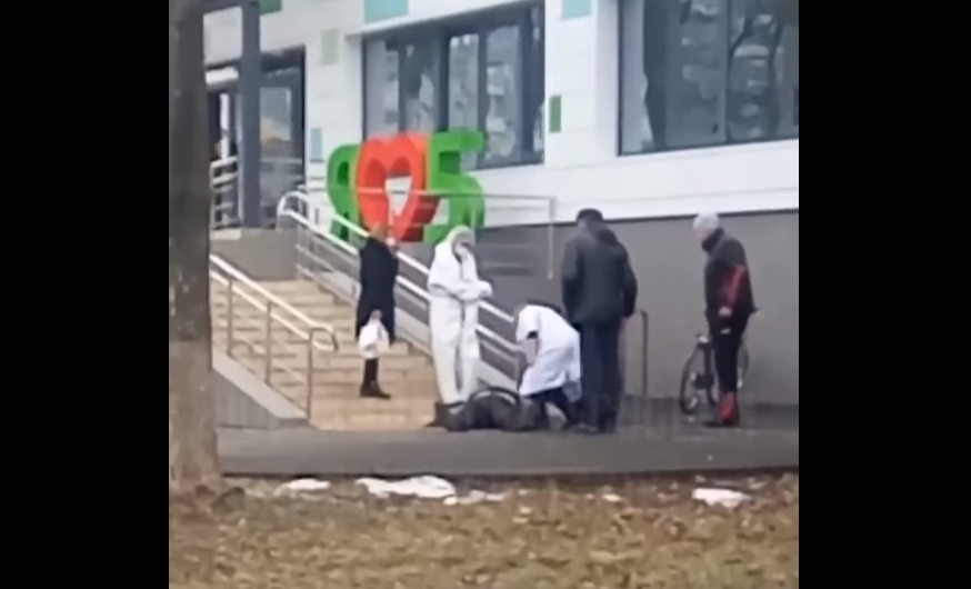 Опубліковано відео з місця подій – на ньому можна бачити, що навколо чоловіка без свідомості ходять люди в білих халатах.