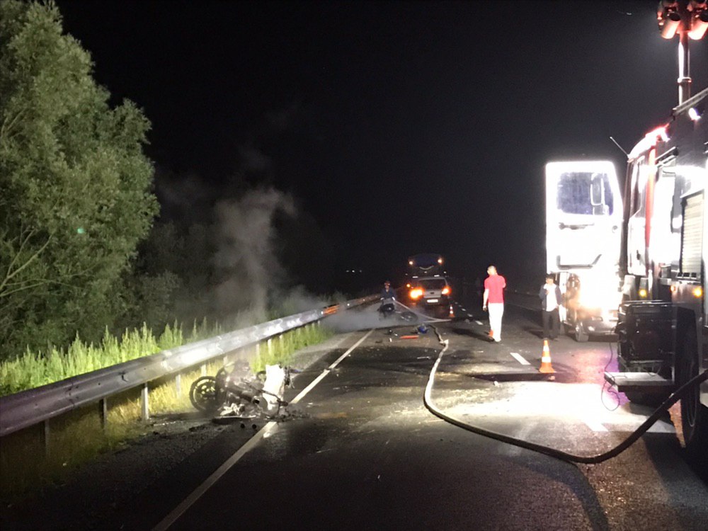 На фото видно, що мототранспорт тільки-но погасили пожежники. Інформації про постраждалих поки немає. Зараз на місці працюють поліцейські та медики з бригади швидкої допомоги.