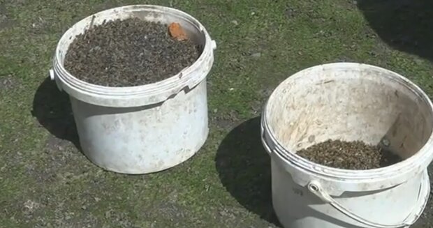 Бджоляр Степан вже чотири дні виносить відра з мертвими бджолами з його вуликів. У нього пропало 200 000 комах і вони далі продовжують гинути.
