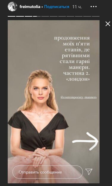 “Я серйозно займаюся етикетом, і деякі друзі бояться зі мною вечеряти. “А раптом не так голову над тарілкою тримаю?” Я вірю в силу хороших манер. Протягом 5 днів розповім про 5 етапів мого життя і як я змінювалася під впливом хороших манер”, – заявила Фреймут.