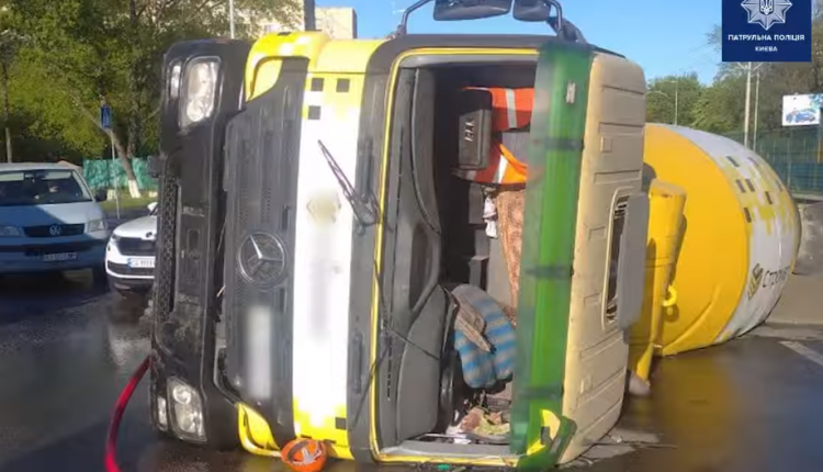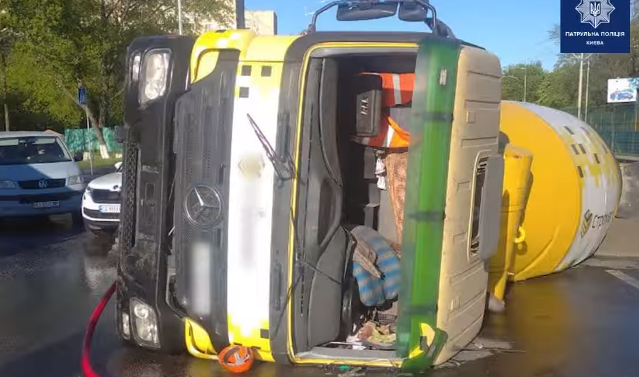 Вранці 12 травня на проспекті Леся Курбаса у Києві перекинувся бетонозмішувач Mercedes. Водій був п’яний.