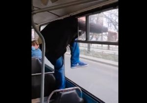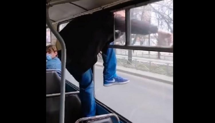 Пасажиру таки вдалося застрягнути частиною тулуба, та, коли кондукторка підбігла до порушника, той уже виліз назовні та показав середній палець з вулиці.