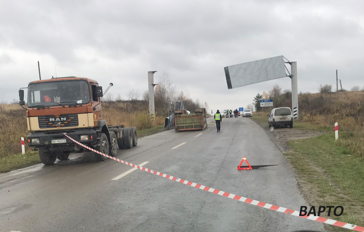 Сьогодні вранці, 20 листопада, поблизу Дрогобича, навпроти автозаправки “WOG”, трапилась ДТП. У вантажівки, яка перевозила пісок, під час їзди, піднявся кузов.