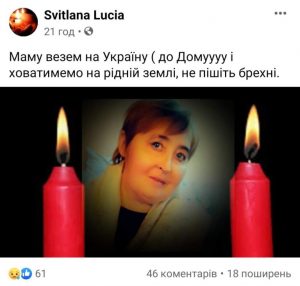 Як повідомила донька помперлої у facebook, що померлу жінку везуть ховати на Батьківщину.