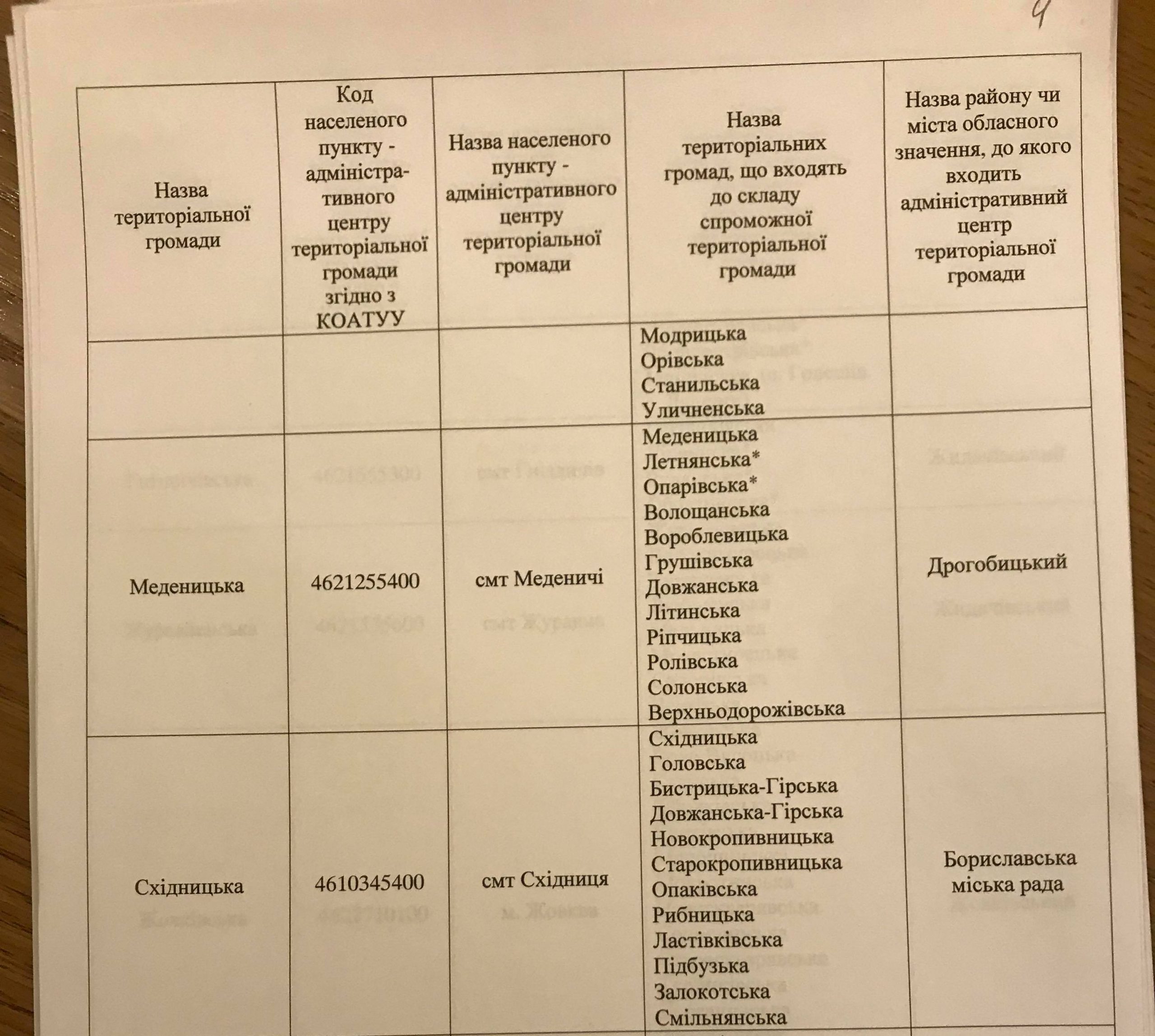 Відомо, що у Дрогобицькому районі буде 5 ОТГ: Дрогобицька, Бориславська, Трускавецька, Меденицька, Східницька.
