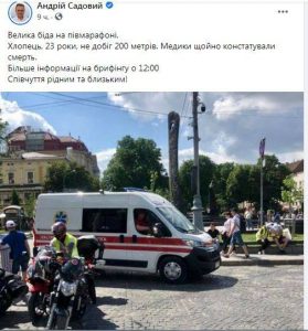Про трагедію повідомив мер Львова Андрій Садовий 27 червня. “Велика біда на півмарафону. Хлопець, 23 роки, не добіг 200 метрів. Медики щойно констатували смерть”, – написав Садовий і додав, що більше інформації буде повідомлено на брифінгу.