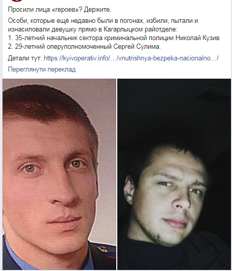 Правоохоронці назвали імена поліцейських, які підозрюються у жорстокому зґвалтуванні 26-річної дівчини в місті Кагарлик (Київська обл.).