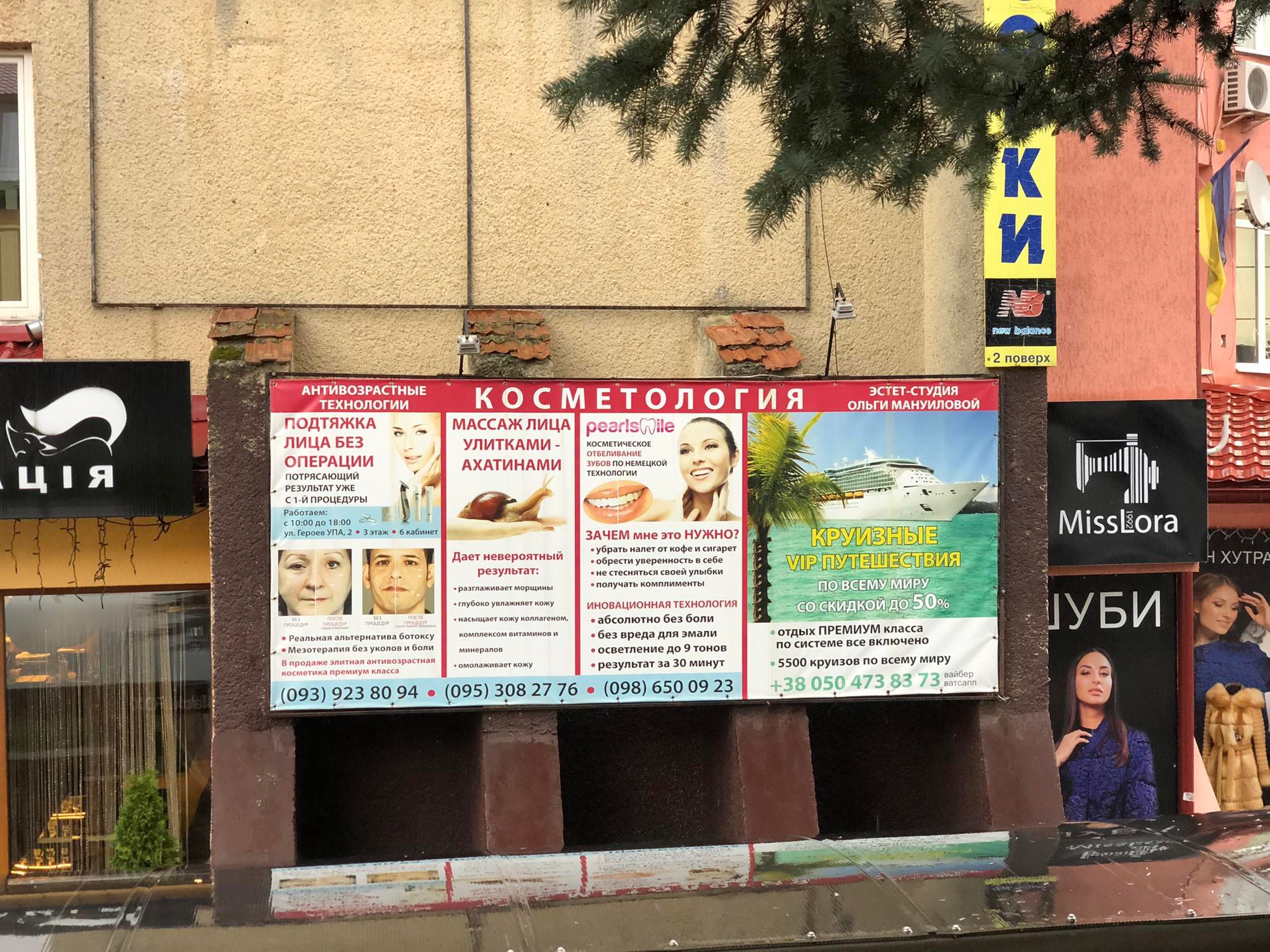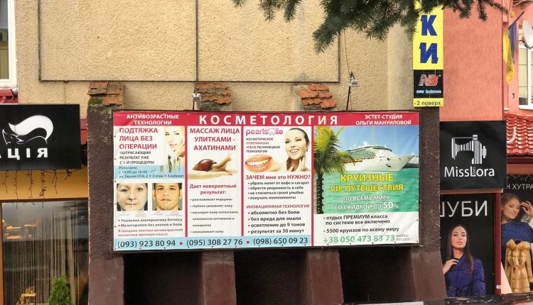 У курортному місті Трускавець на вулиці Героїв УПА, 2, на 170 день повномасштабного вторгнення росії в Україну досі можна зустріти зовнішню рекламу мовою окупанта.