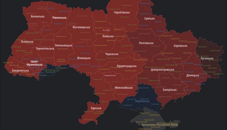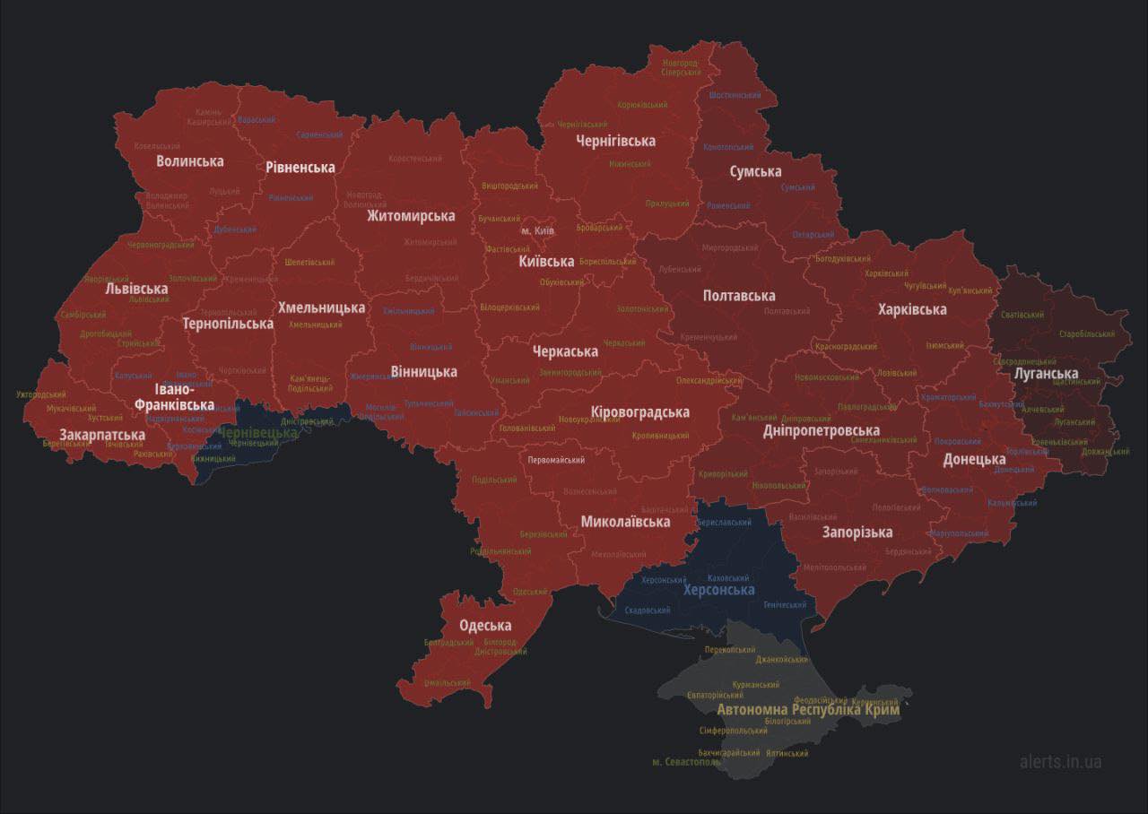 Загалом повітряна тривога оголошена в всіх областях України, крім Чернівецької і тимчасово окупованої Херсонської.