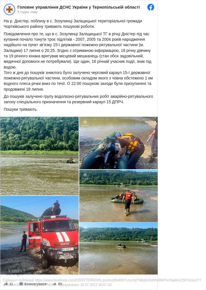 Виїздом на місце події правоохоронці встановили, що під час відпочинку на ріці Дністер втопився неповнолітній місцевий житель. Хлопець разом з сестрою та другом купався в річці. Раптово усі троє почали тонути. 18-річну дівчину та 19-річного юнака врятував місцевий житель. А 16-річний хлопець зник під водою. Його тіло рятувальники досі шукають.